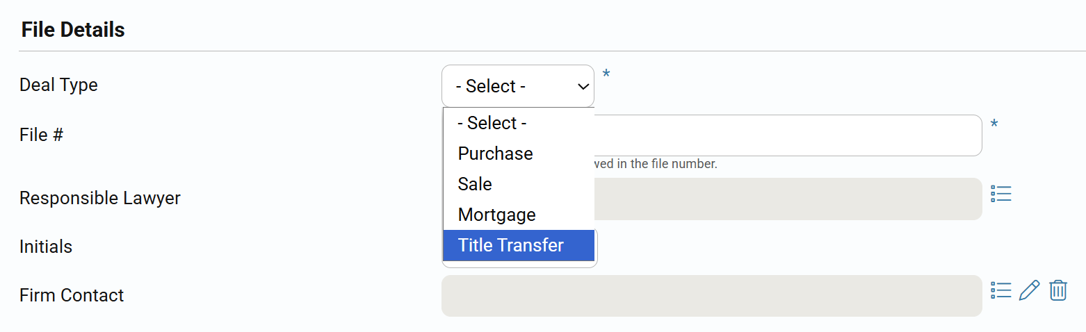 A Title Transfer file helps you manage and track transactions where ownership is being transferred. To get started, click on +File on the main screen and select "Title Transfer" as the deal type. After entering your file number, you can click Create File to open your file.