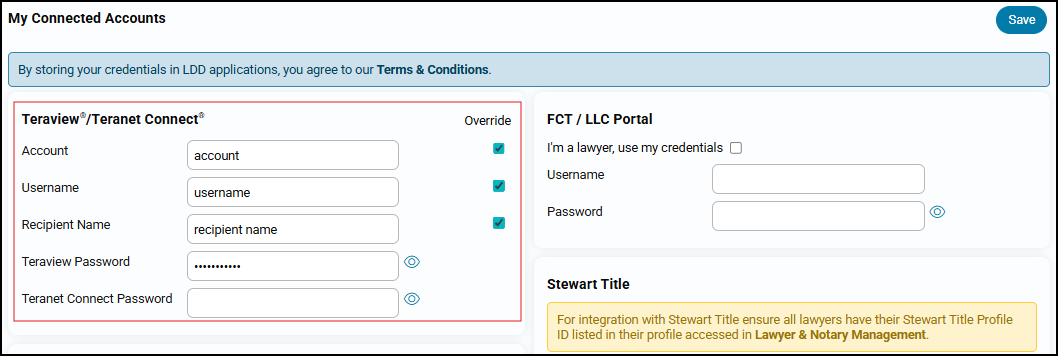 The My Connected Accounts screen will appear. The first section of the screen deals with Teraview / TeranetConnect credentials:
